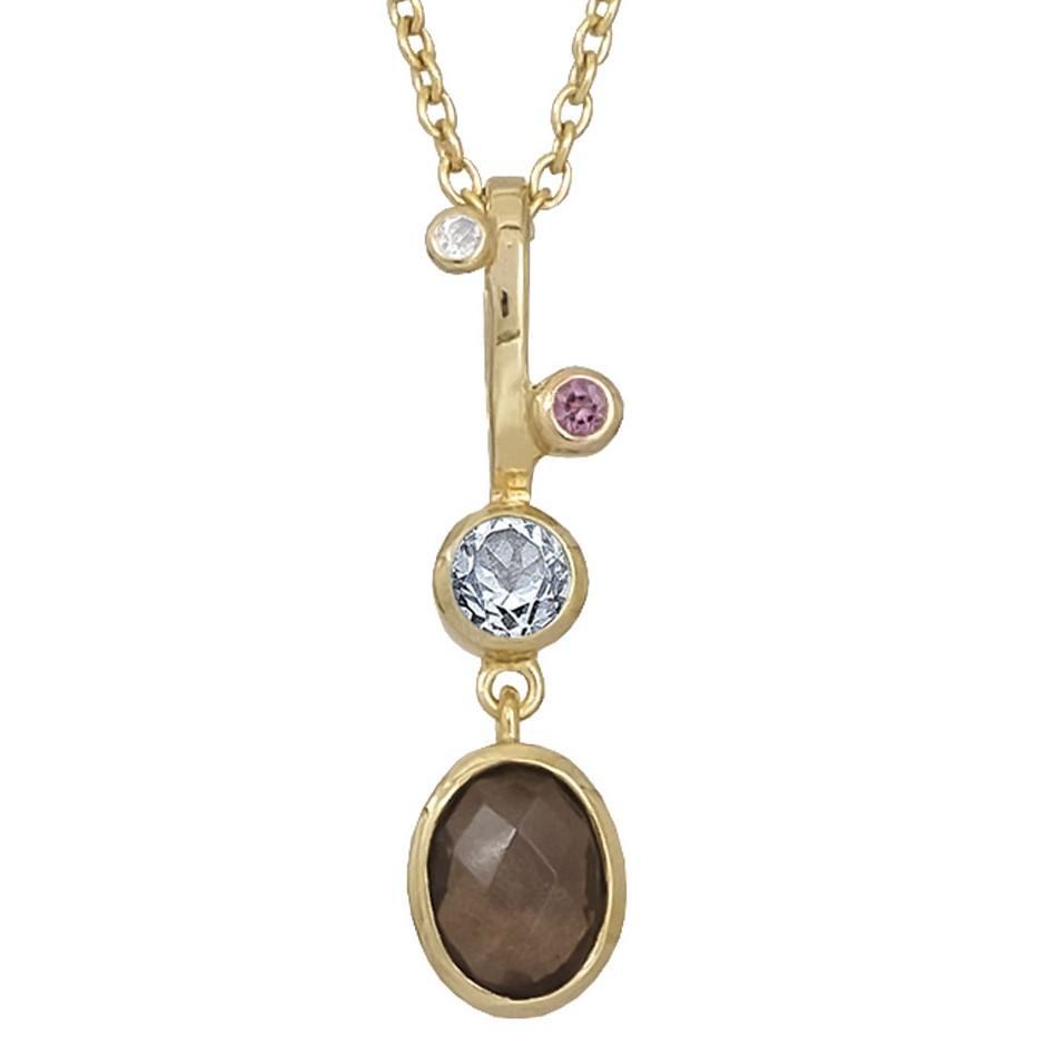 Halskæde i forgyldt sølv med 8x6mm røgkvarts, 4mm sky blue topas, 2mm pink turmalin og 1,5mm hvid topas. Halssmykket er fra serien Glam fra Rabinovich - længde 42/45 cm.